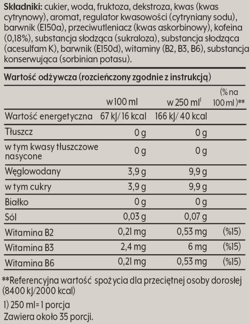 Składniki: cukier, woda, fruktoza, dekstroza, kwas (kwas cytrynowy), aromat, regulator kwasowości (cytryniany sodu), barwnik (E150a), przeciwutleniacz (kwas askorbinowy), kofeina (0,18%), substancja słodząca (sukraloza), substancja słodząca (acesulfam K), barwnik (E150d), witaminy (B2, B3, B6), substancja konserwująca (sorbinian potasu).