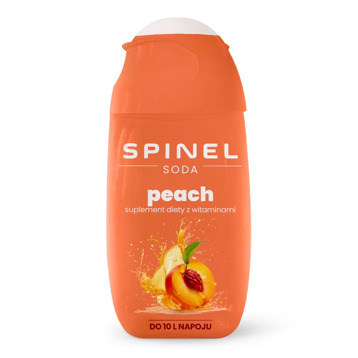 Syrop Spinel Soda o smaku brzoskwiniowym – bez cukru, z witaminami B1, B3, B6. Jedna butelka 65 ml wystarcza na 10 litrów napoju.